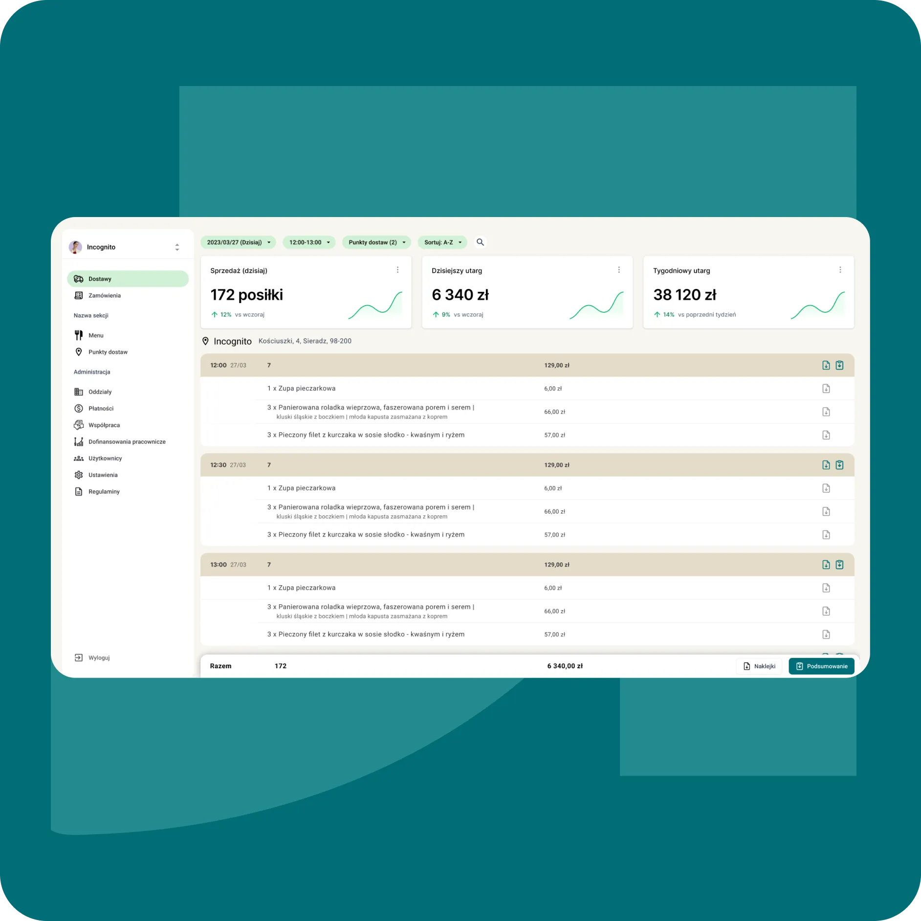 Menu, dostawy, płatności i raporty – wszystko ogarniasz z jednego panelu. Automatyzujemy procesy, a Ty skupiasz się na gotowaniu.